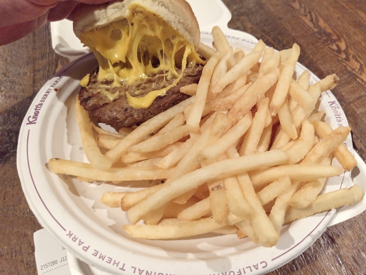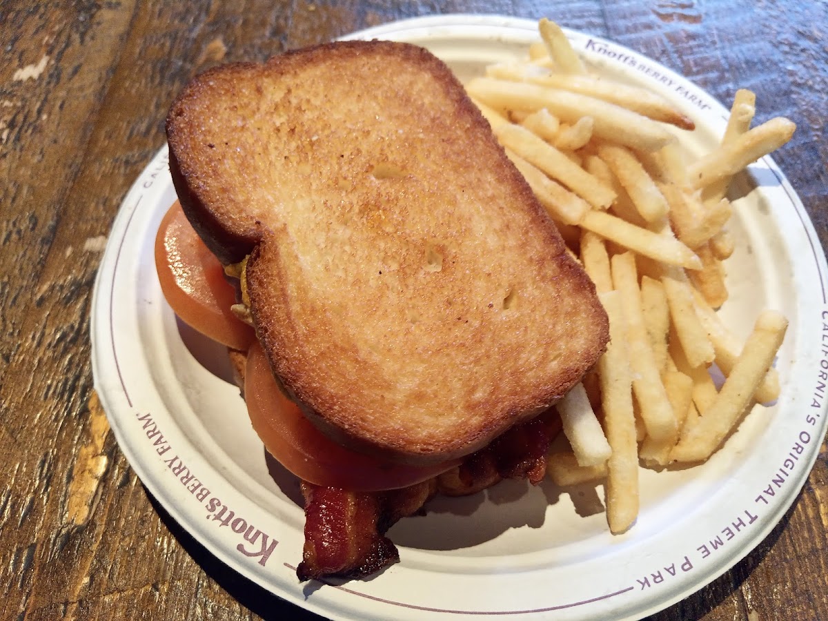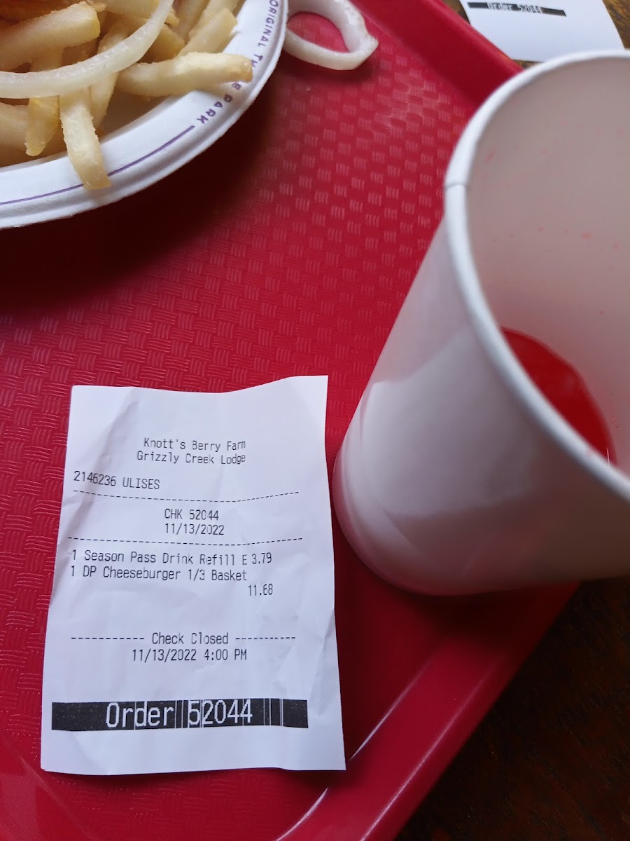 We like to get breakfast here - they have what the call "breakfast melts". Choose from Bacon, Ham or veggie, I recommend the bacon melt. The melts consist of 2 half's of an English muffin (so 2 pieces), with an egg on each half - served as an open face sandwich, with a creamy sauce and melted cheese. They are delicious. You also get a side order - I normally get a side salad or Mac and cheese (M&C is BOMB here). My favorite part about this place, is that it is the only place in Knott's that has Jalapenos - they are in the self serve condiment bar, so I always SMOTHER my food in them, lol! Meal plan eligible.
